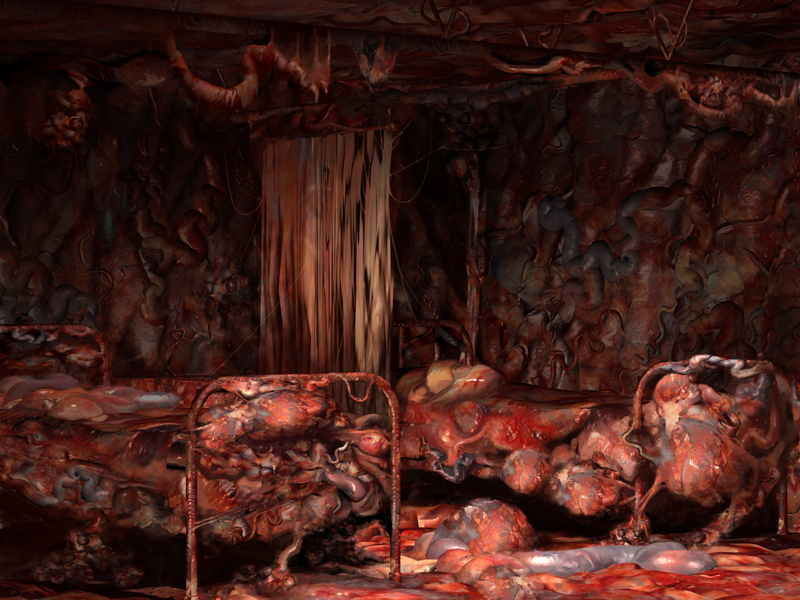 It's a terrible sight. Bone. Blood. Muscle. Lipids. Viscera. The room, which you can identify as a hospital room by the shape of it and little else, is covered from top to bottom in it. Or, rather, it may be more accurate to say that the entire room and everything within it is constructed from it. The IV drips next to their beds are filled with some sickly yellow liquid which, up until a few minutes ago, was being steadily fed into their veins. The screen on the EKGs is barely visible through the entrails wrapped around the entire console. The mattresses on their beds can barely be called that, seeing as how they are more akin to slabs of rotting meat than anything else.
